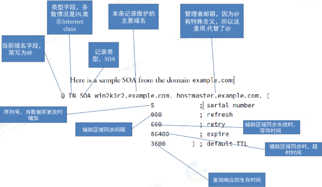 Start of Authority Records:SOA记录是DNS区域的第一条记录,定义了DNS区域的通常参数NS记录