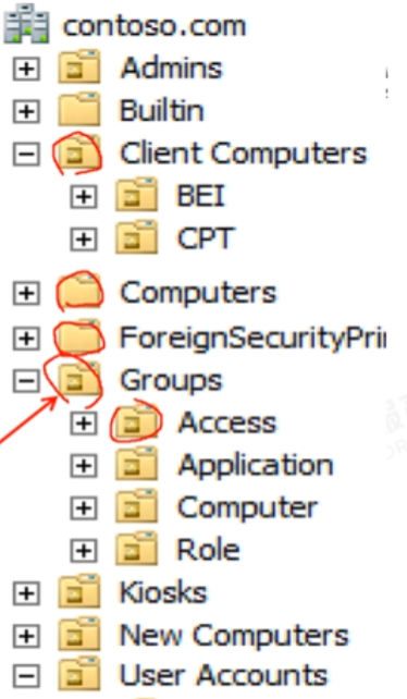 下图是一个活动目录的树形结构图,每个有个小书图标的小文件夹就是一个组织单元,没有小书图标的就是容器
