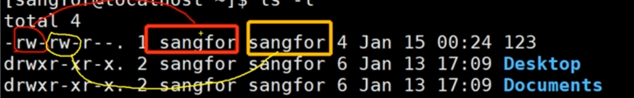 作为普通用户是无法更改文件或者目录的所有权的,只有root用户可以更改所有权,下图红色表示所有者,黄色表示文件所属组