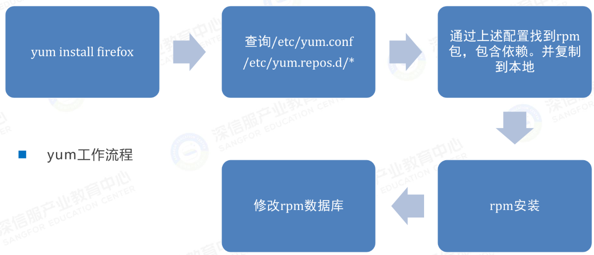 YUM(Yellowdog Update Modified) 项目着手解决RPM软件包依赖的问题,主要作用是将RPM不再视为单一软件包,而是视为一个软件库