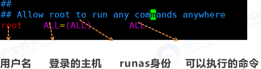 在文件中我们可以找到上面两行,第一行是说允许 root 用户运行任何命令