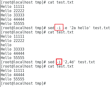 前面的操作,知识在屏幕上按照要求输出了内容,而文件本身没有改变,sed也可以用于文件自身的修改,但这样操作非常危险,有可能误操作将文件改坏,所以我们必须有把握才能这么做