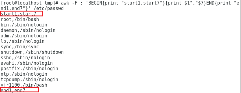 awk -F : 'BEGIN{print "start1,start7"}{print $1","$7}END{print "end1,end7"}' /etc/passwd
