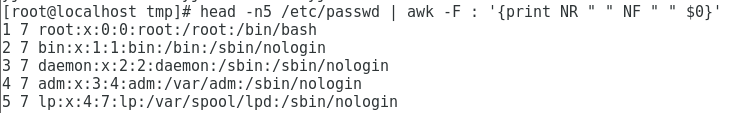 head -n5 /etc/passwd | awk -F : '{print NR " " NF " " $0}'