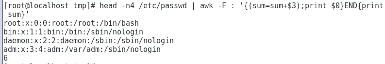 head -n4 /etc/passwd | awk -F : '{(sum=sum+$3);print $0}END{print sum}'