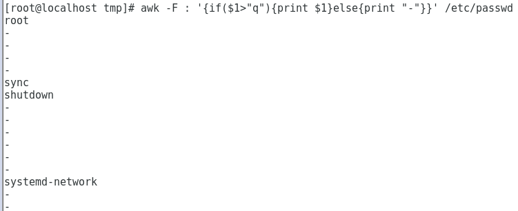 awk -F : '{if($1>"q"){print $1}else{print "-"}}' /etc/passwd