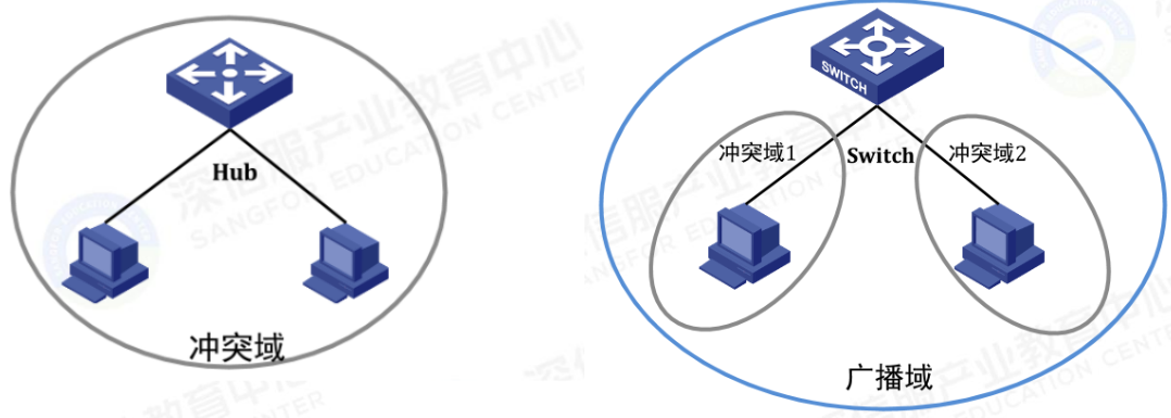 接收同样广播消息的节点的集合。交换机和HUB组成的网络是一个广播域。路由器的一个接口下是一个广播域。所以路由器可以隔离广播域