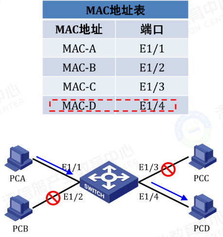 MAC地址表:交换机端口与主机的MAC地址的对应关系,可初始化并自动学习。