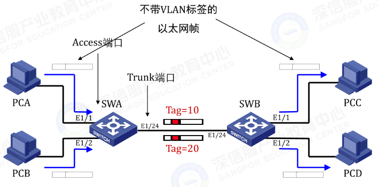- Trunk端口:允许多个VLAN通过,用于交换机之间连接
