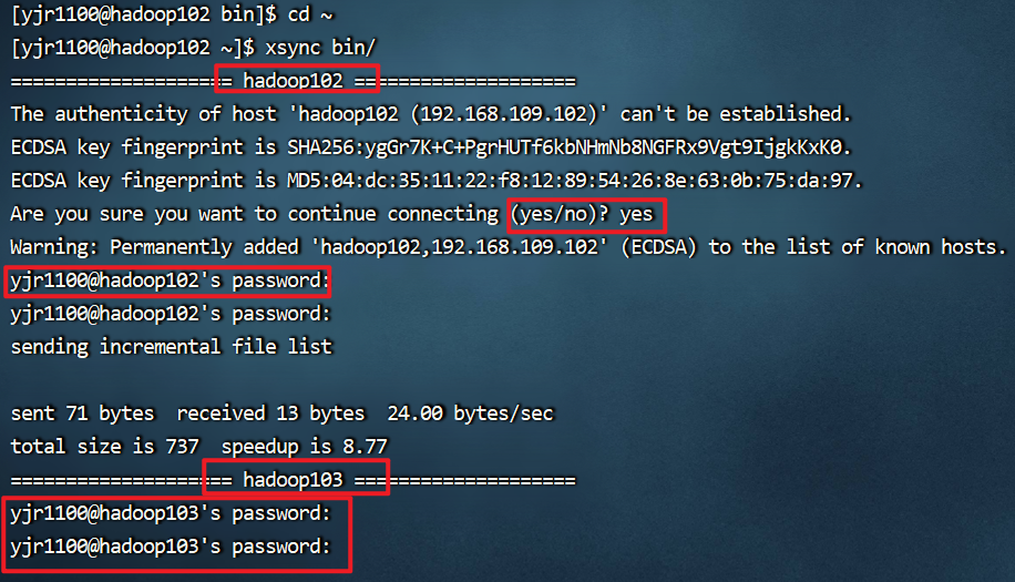 同样,需要输入hadoop102上yjr1100的密码进行拷贝,如下图所示