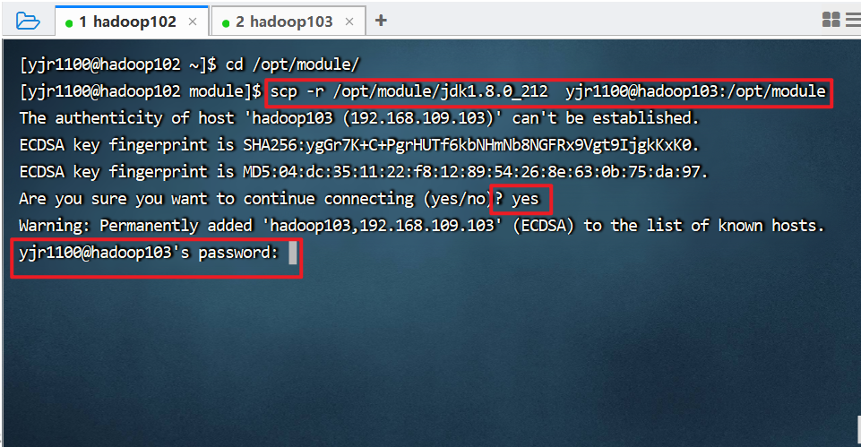同样,需要输入hadoop102上yjr1100的密码进行拷贝,如下图所示