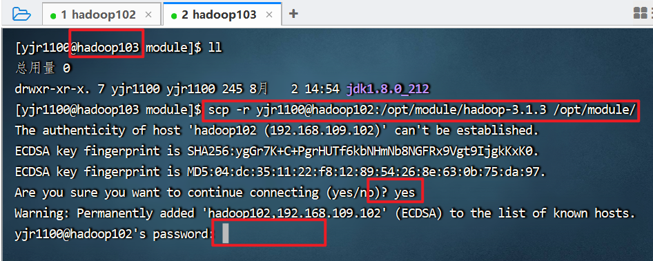 scp -r yjr1100@hadoop102:/opt/module/hadoop-3.1.3 /opt/module/