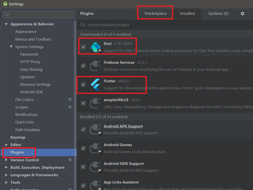 Android studio 这个直接官网下载安装就好了,下载完后,进入软件下载插件,在红框处搜索需要的插件进行下载,下载完后要重新加载窗口下载Fluter SDK