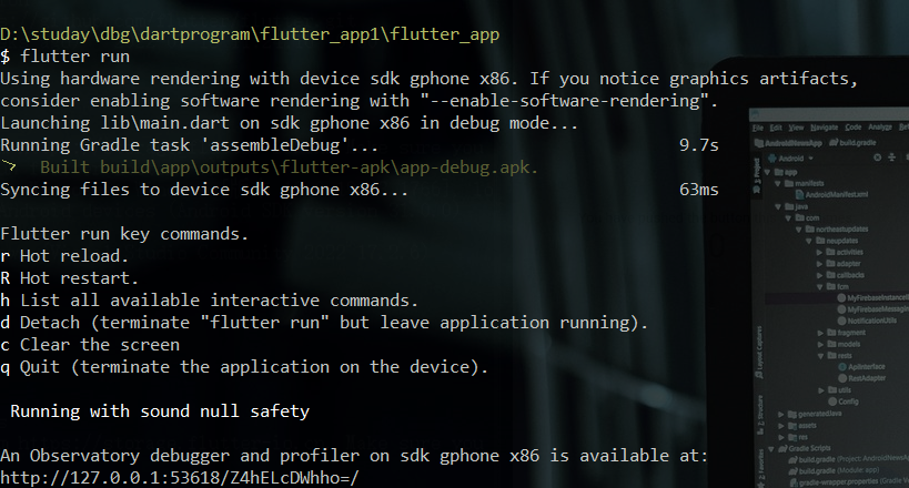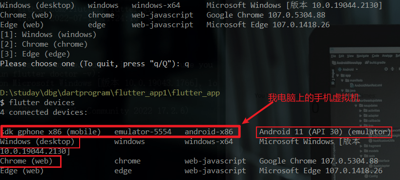 命令来运行项目,我们需要进入项目的目录,并且在电脑上使用虚拟机打开一个手机。通过 flutter devices