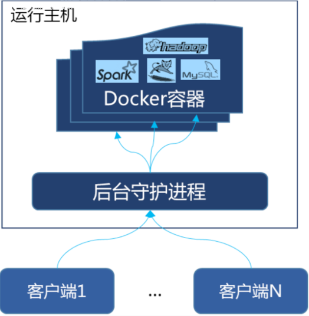 Docker也是一样,如上图,通过客户端连接,然后操作后台守护进程进行操作。
